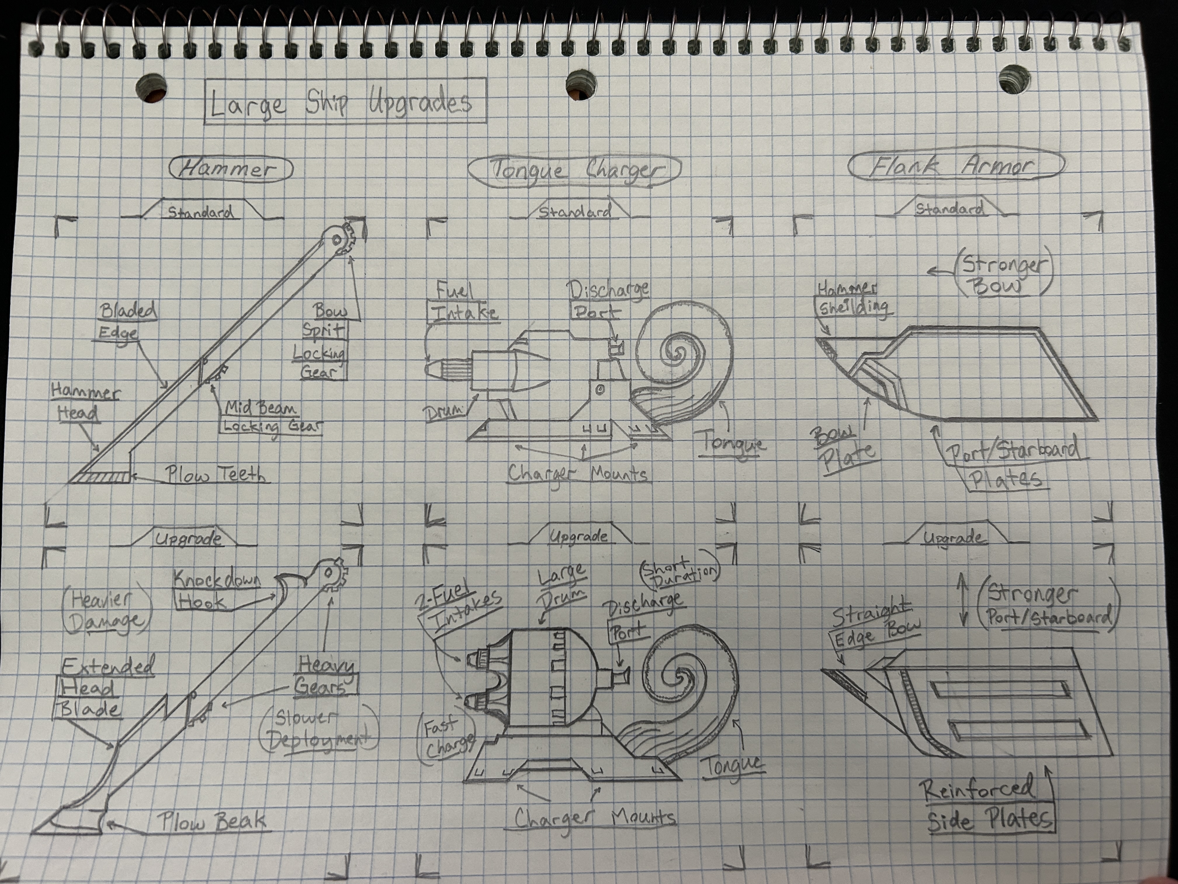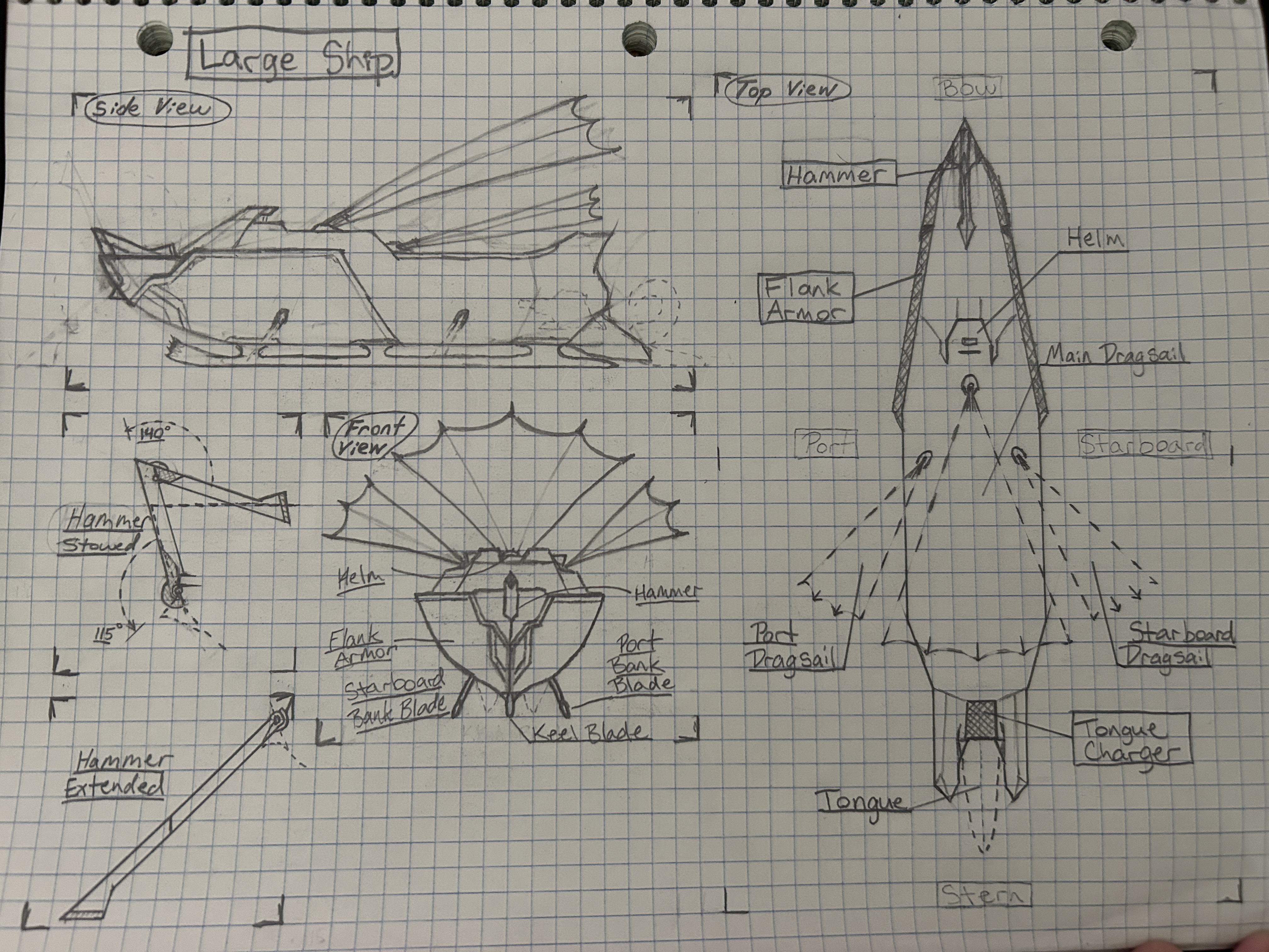 About the Large Ship: The Large ship is designed to deal serious damage with head on collisions. I was inspired by things like Battle Bots and Pirates. Theoretically players could unlock more armor and upgrades for their ships, so I took a modular approach to each of the major parts. This ship showed me how vital Reference Material can be, because at times I did get lost in ambiguity and found that I needed more references.