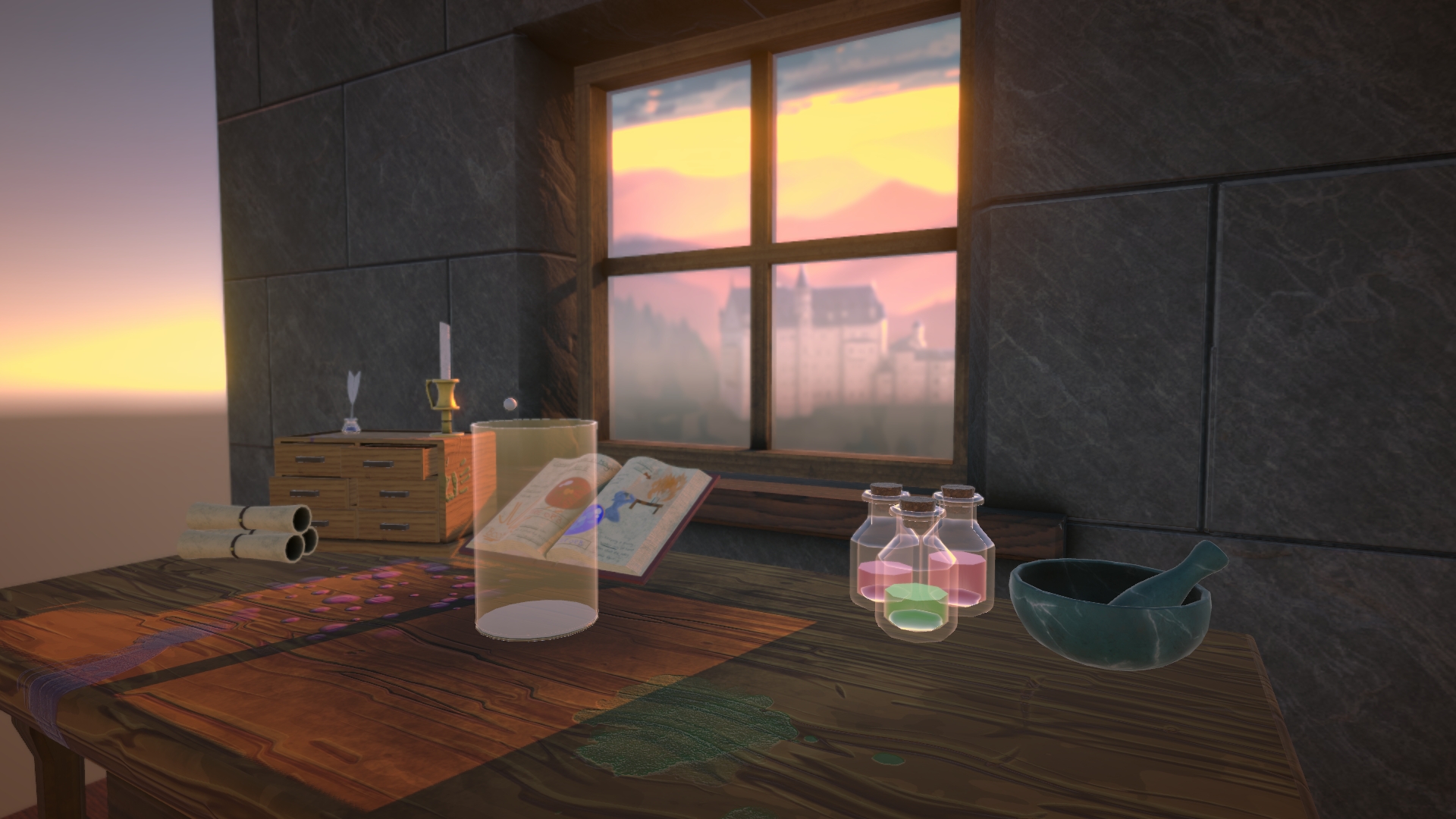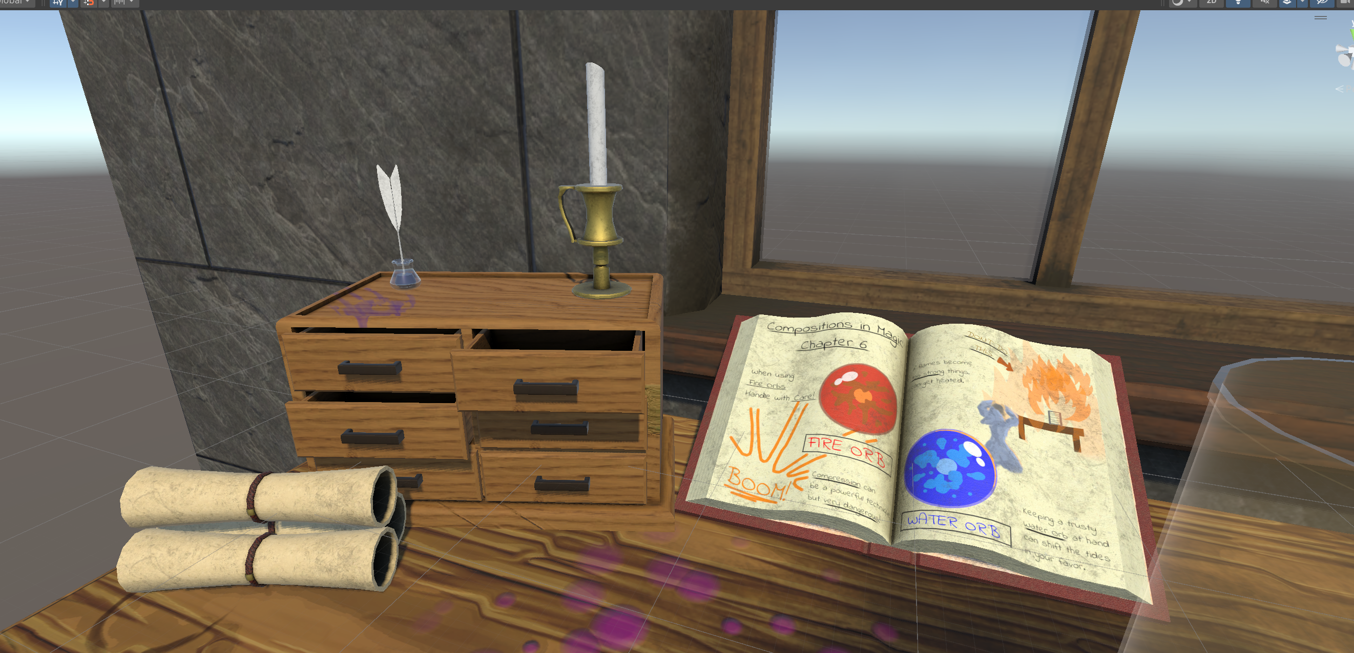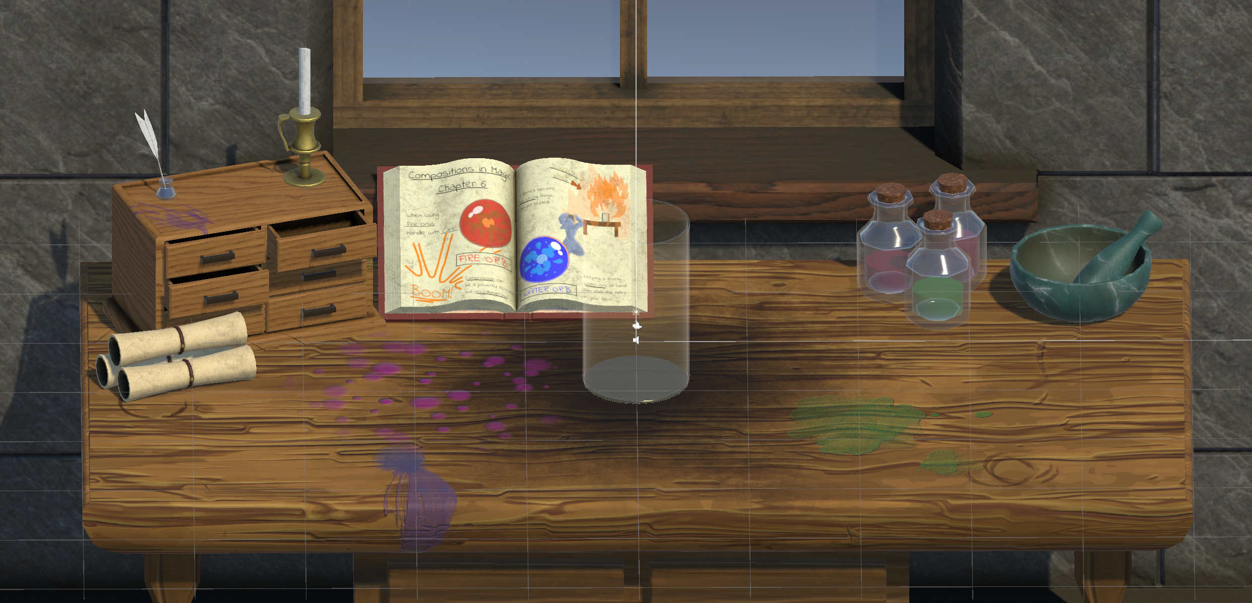 About the Game Environment: According to the premise of the game. The player is a magical artificer, who toils away in their magical workshop making “Cans” of magic for the kingdom. The game design is a +1 design of Suika Game. Given the setting I designed this environment from a single perspective. The player can see in the background a desk with items cluttered about. They also see a kingdom out the window, with the sun setting on the horizon. My favorite prop was the magical textbook I made to give the scene some comical relief.