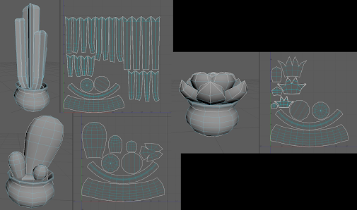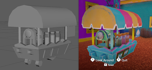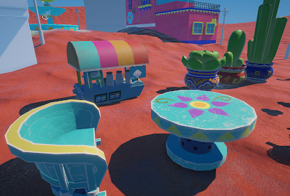About my contribution: The models that I was responsible for replicating during this project were a lot of fun, and you can see several of them in the pictures below. One of the things that helped me a lot in the process was that I have the game myself and I was able to run around the scene taking screen shots. That is how I got many of the profile angled reference images. The most intricate model that I made was the Snow Cone Cart and my favorite textures are the Cactus Pots. In Substance Painter I detailed the paint on the pots by hand.