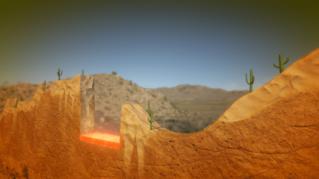 About the Desert: Texturing these 4 levels was a lot of fun. I made waterfalls out of sand, and spikes of sandstone. These were the final 4 levels of the game so they are more difficult for the player, but making them was faster, because I had the method down pretty well by then. The Terrain is housed in an “island” object which was made by our 3D artist, along with the skybox.