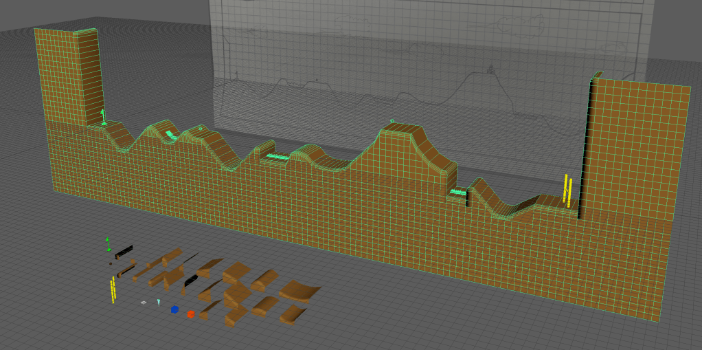About the Level Design: When I first started, I was unsure of how the levels would be created. Our lead designer didn’t know whether the game should be Side-scrolling or 3D 3rd Person, and we considered making the terrain destructible at first, but opted out. The method for making the levels took a while to get right. Ultimately I used a NURBS curve in Maya to create the topography, which I then rigorously tested with each level, before moving on to texturing.